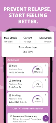 Quitvana hjälper dig att återhämta dig från beroenden. Spåra självskadebeteende, håll dig nykter och förebygg återfall. Sluta med rökning, droger, vaping, alkohol, fap, porr och andra beroenden för att skapa bättre vanor och leva ett beroendefritt liv.
